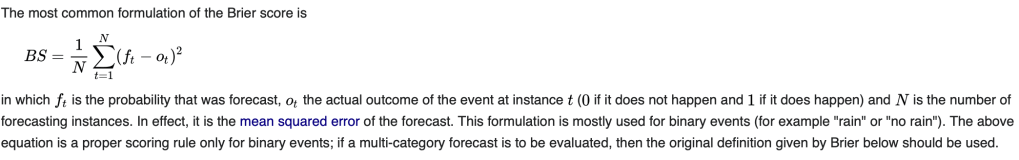 The brier score is the average of the mean squared error for every time frame. For instance if the model predicts a 0.58 probability of winning at a given time and that team won at the end of the game, we add (1-0.58)^2 to the brier score. We add all of these values for the entire game and divide by the total number of events. There is one event every 3 seconds.