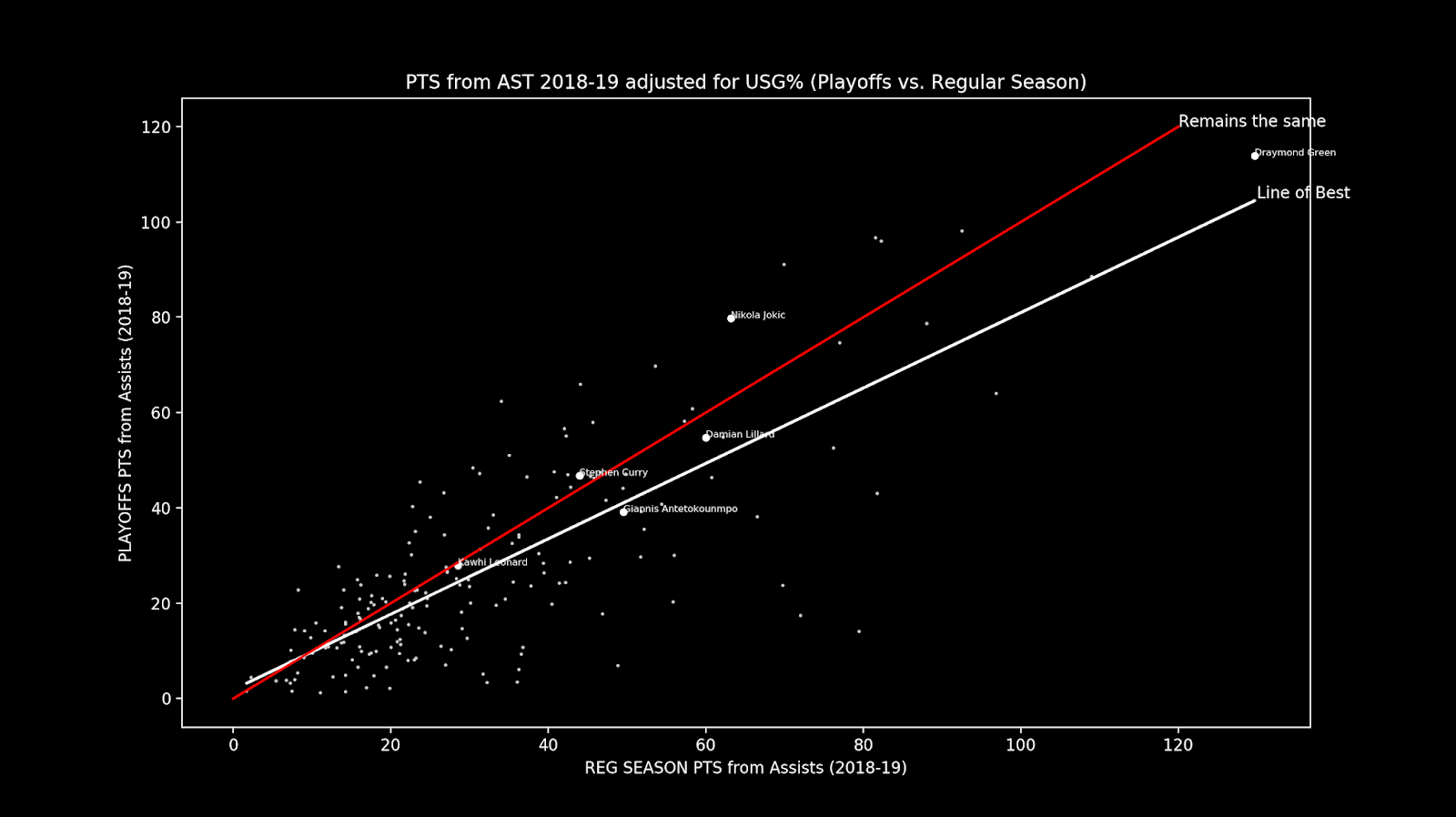 In the graph above, the red line represents a player whose points from assists does not change in the playoffs. However, we see that the try line of best fit here has a slope that is slightly lower than 1 (actually it is about 0.79 with an R^2 of 0.65). This shows that teams in today’s league are becoming more focused on playing through a star player in the playoffs, as we have seen with the effects of superstars in the league. Although we saw (in my previous post) that teams typically employ the same usage rate to important players in the playoffs vs in the regular season, we see here that teams typically make their players shoot more and pass less. Instead of getting points off of assists like they did in the regular season, they find it more beneficial to score through their star players. However, outliers in this dataset remain. Steph Curry has actually created more points from assists in the playoffs than he did in the regular season. We’ve seen this with the type of play the Warriors play.