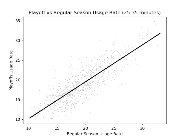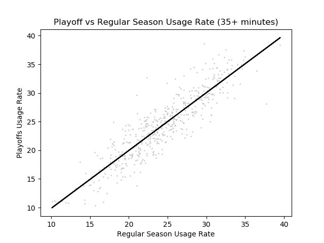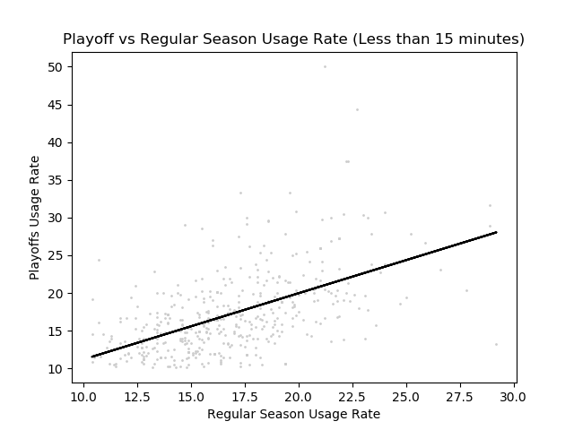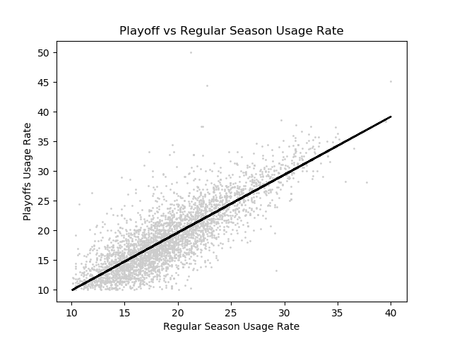 When we look at games in the playoffs, we see completely different strategies employed by teams. Star players seem to be more relied on than they would in the regular season, while players with smaller roles seem to be less useful than in the regular season. This ‘hunch’ can be represented with a graph of usage rates in the playoffs vs in the regular season. Here is a graph (with a line created with a basic linear regression algorithm).